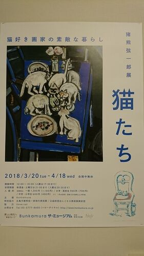 「猪熊弦一郎展 猫たち」をみに渋谷のBunkamuraザ・ミュージアムへ。 入口がわからず、東急百貨店の正面入口から反時計回りしてしまった。 10時の開館前に到着。混雑はそれほどでもなく、20人ほどの行列にとどまる。 開展翌日の祝日ですが、さすがに天候が悪…